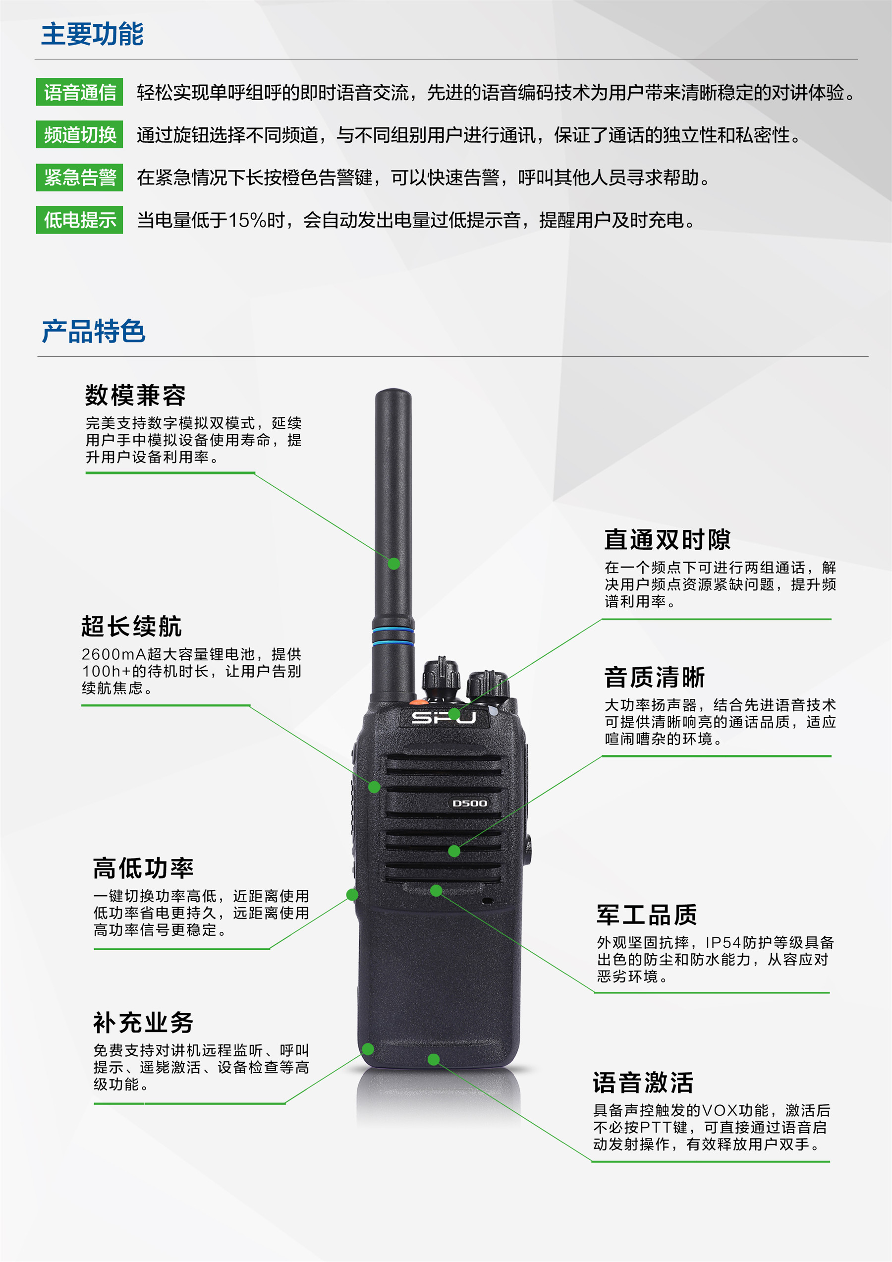 产品简介:对讲机,在不需要任何网络支持的情况下,就可以通话,没有话费产生,适用于相对固定且频繁通话的场合,由外壳、主机、电池、皮带夹,座充、天线组成。对讲机有三大类:模拟对讲机、数字对讲机、IP对讲机。